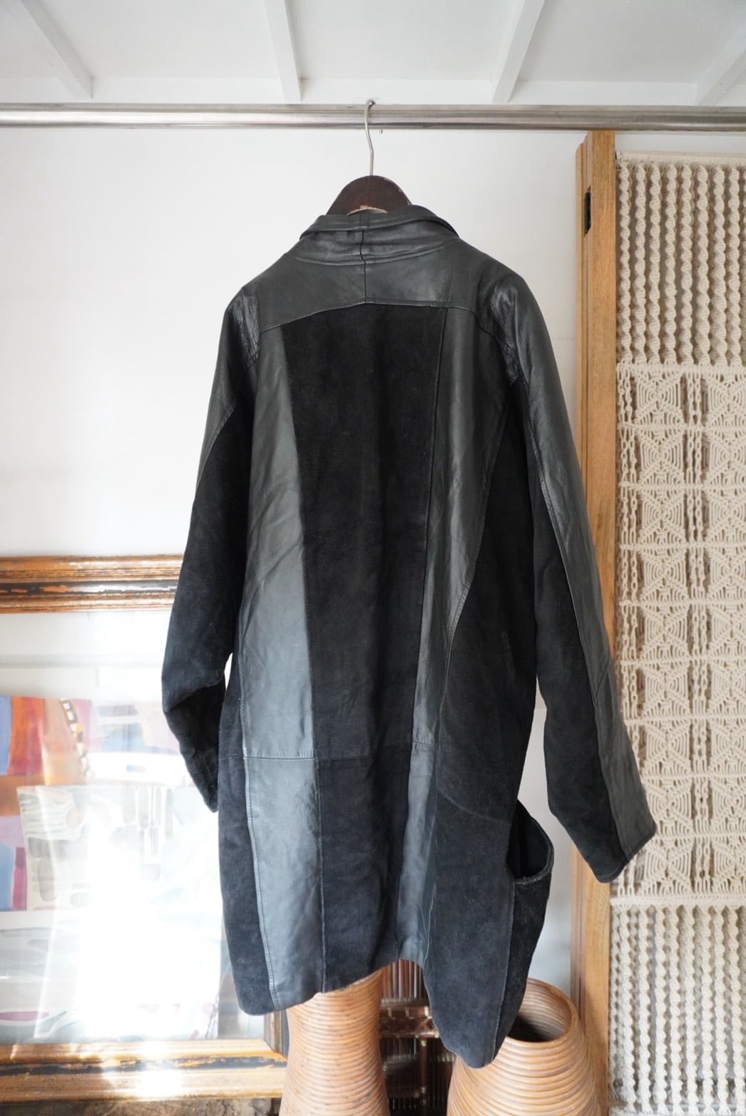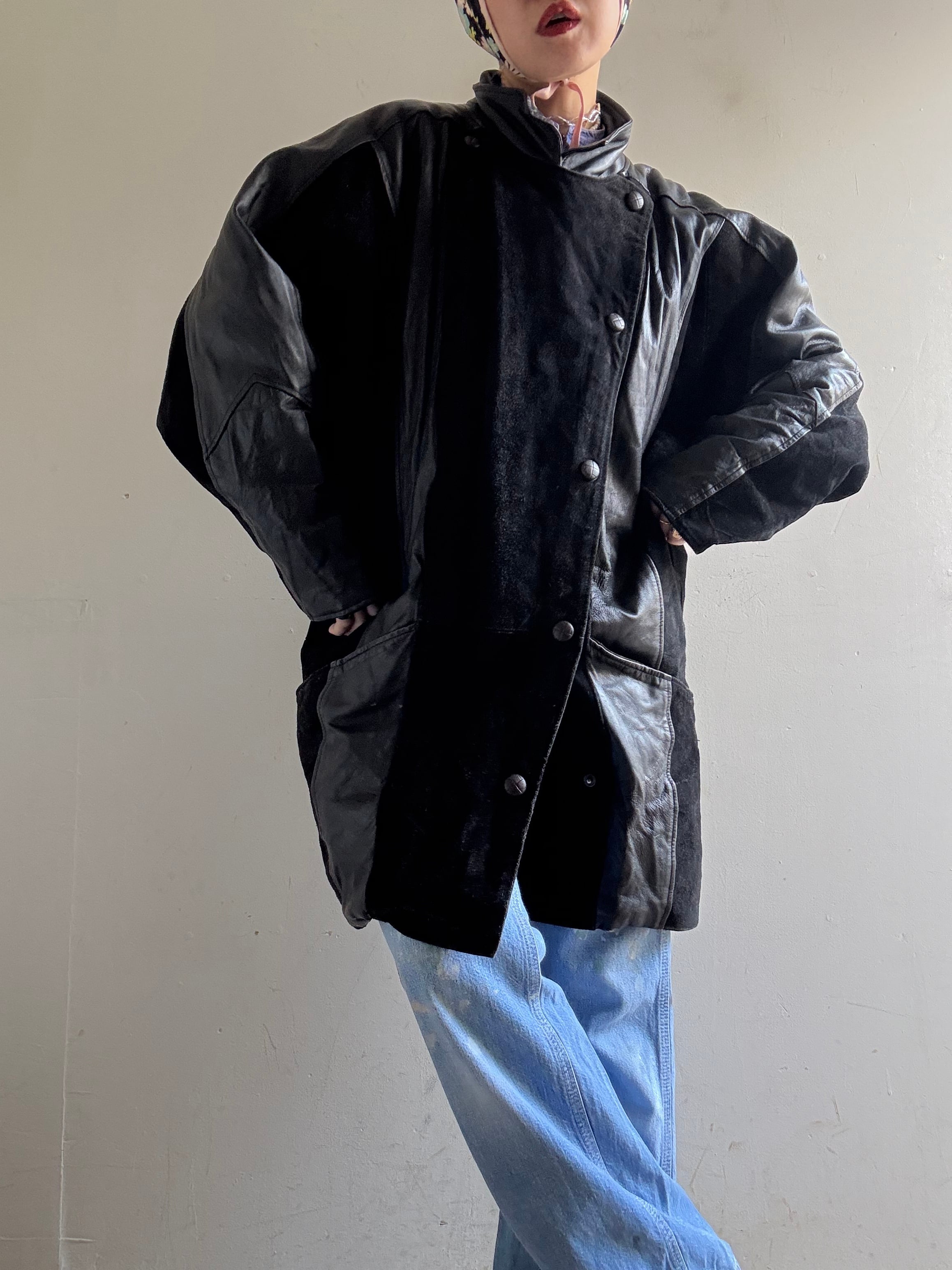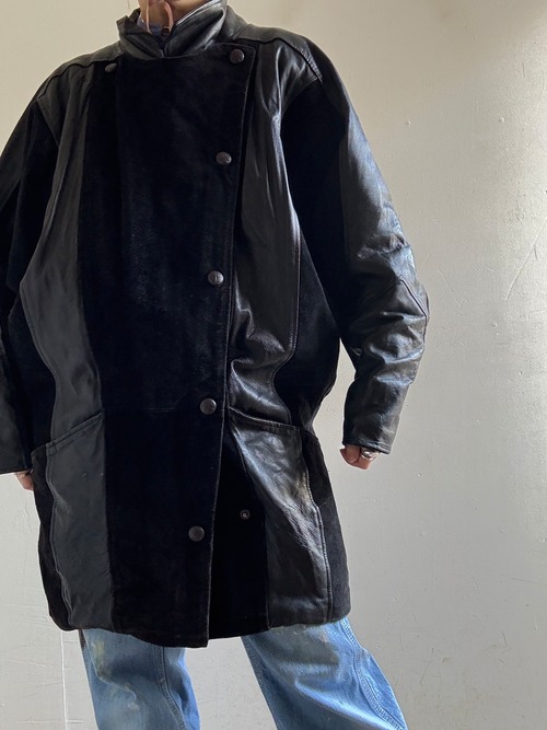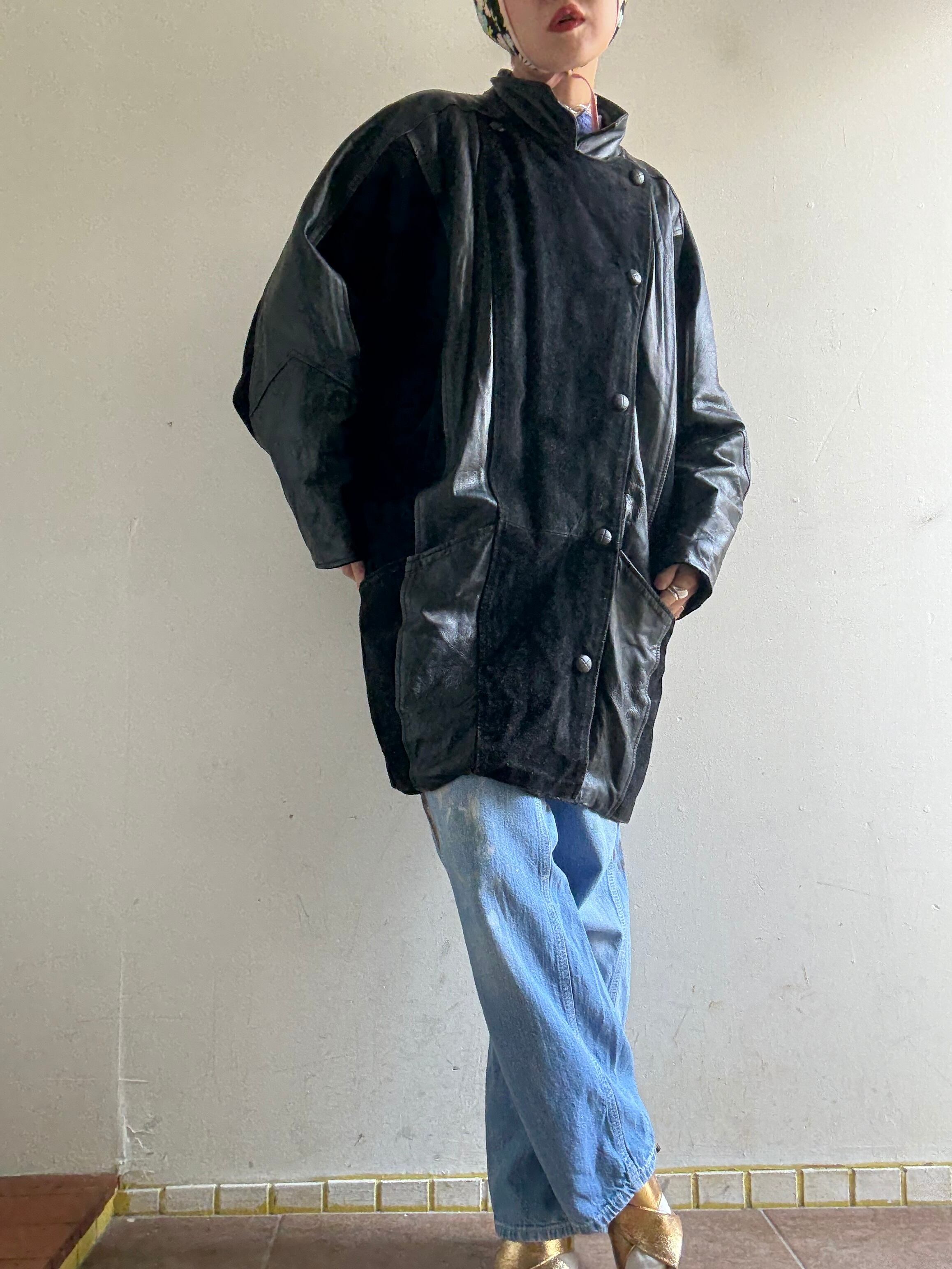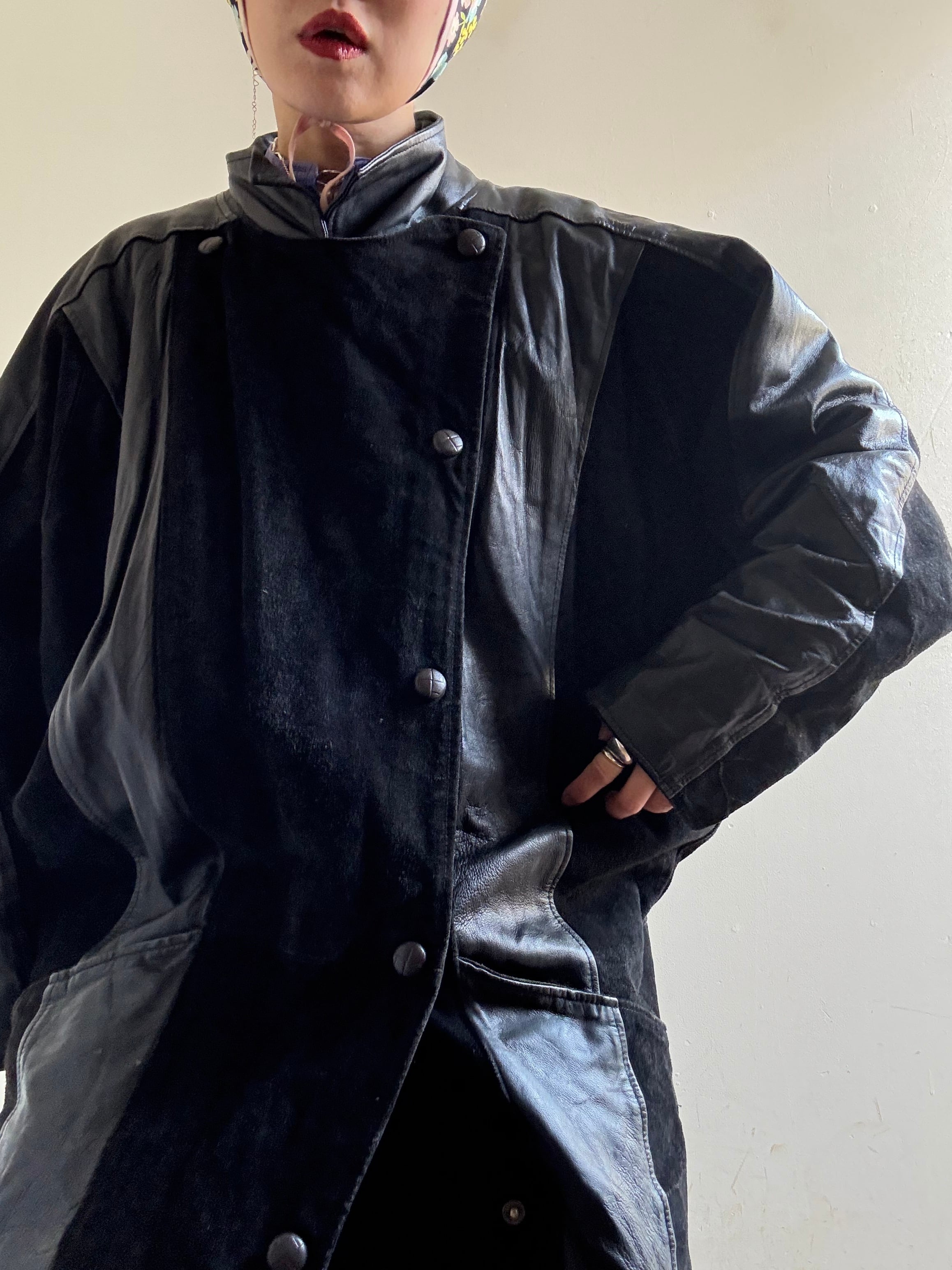 1980s Vintage Double Buttons Leather/Nubuck Patchwork Coat
