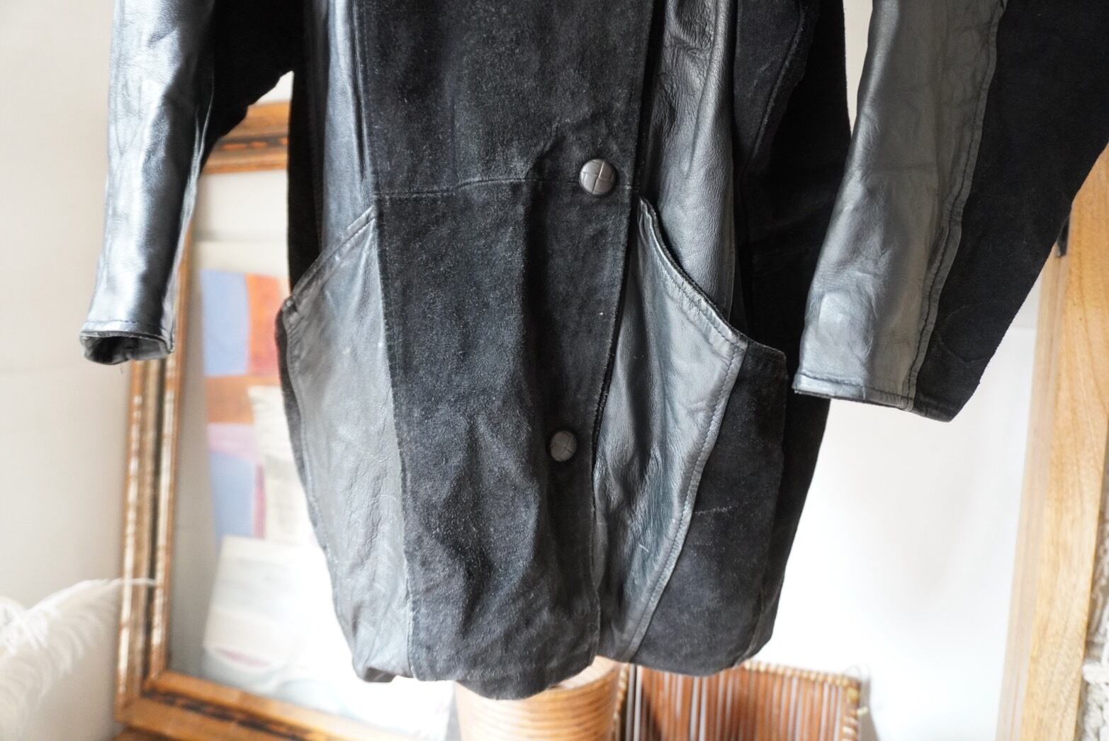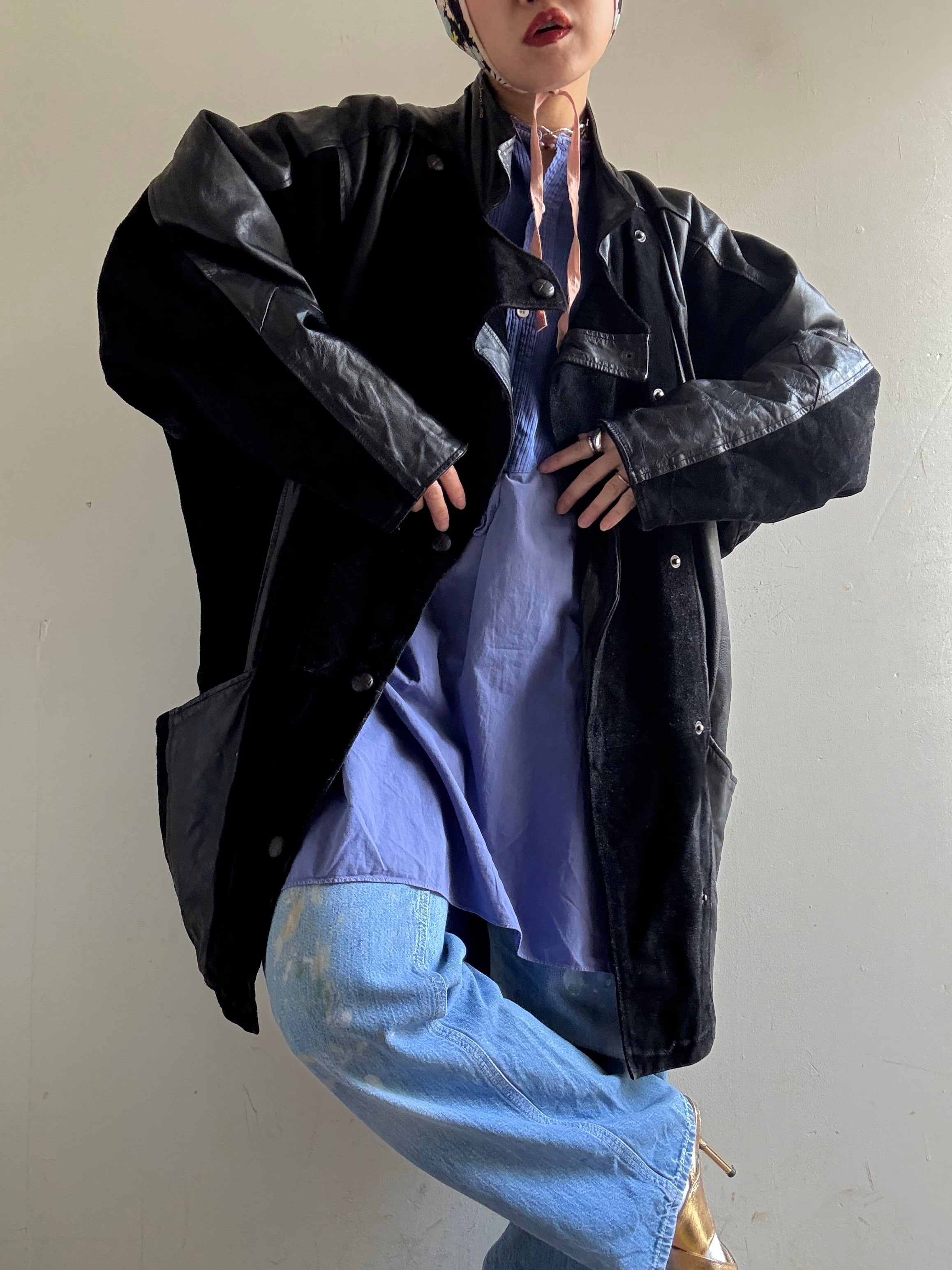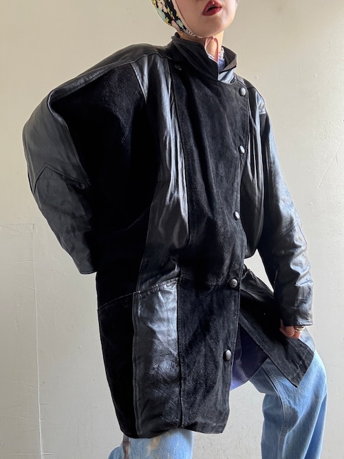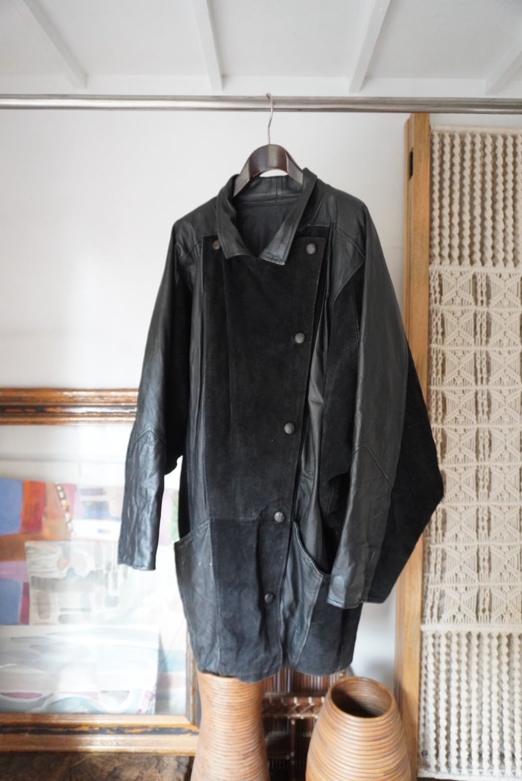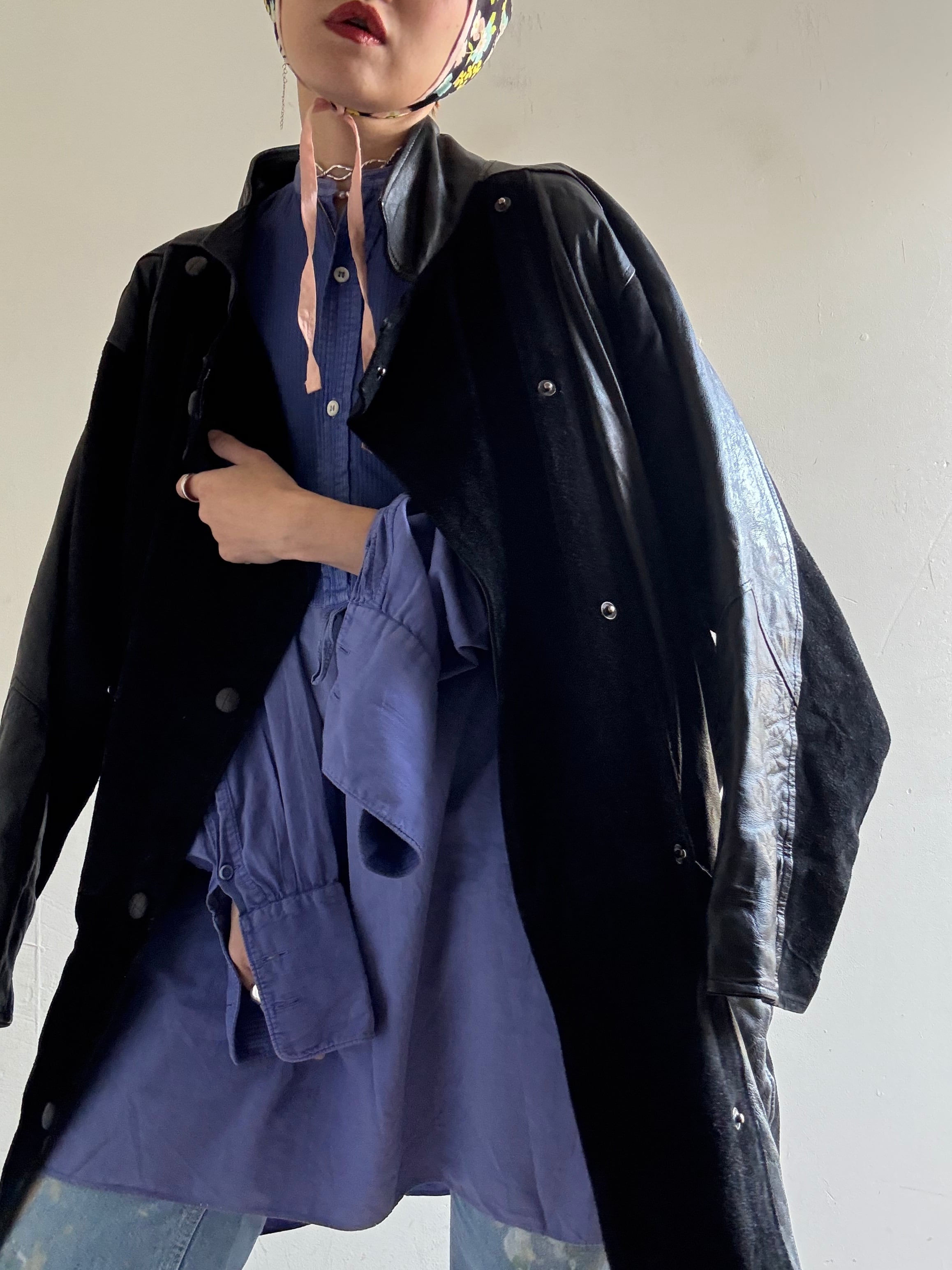 1980s Vintage Double Buttons Leather/Nubuck Patchwork Coat