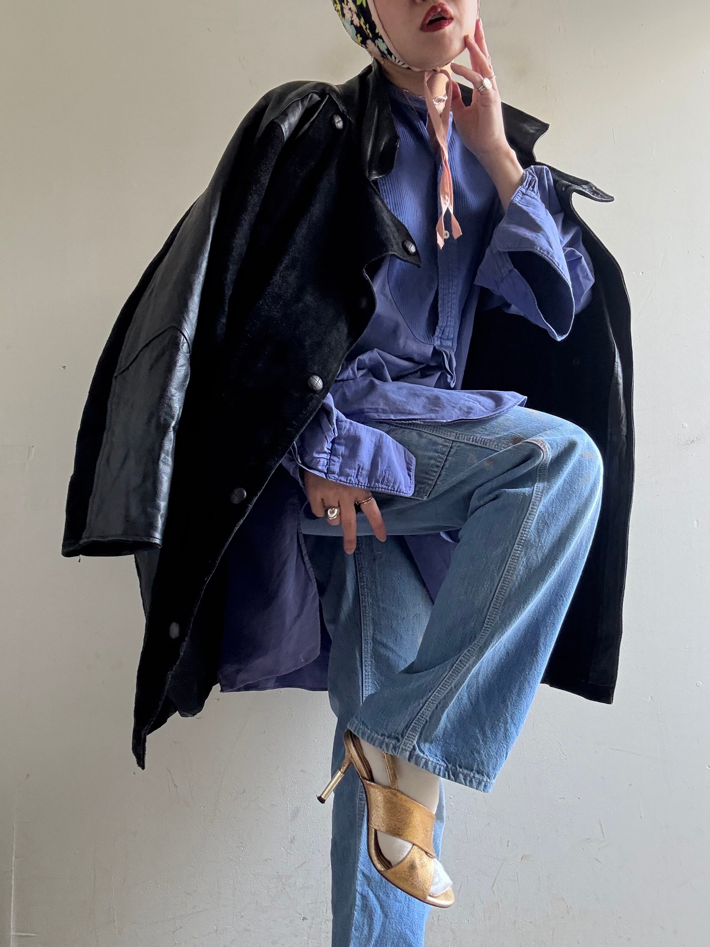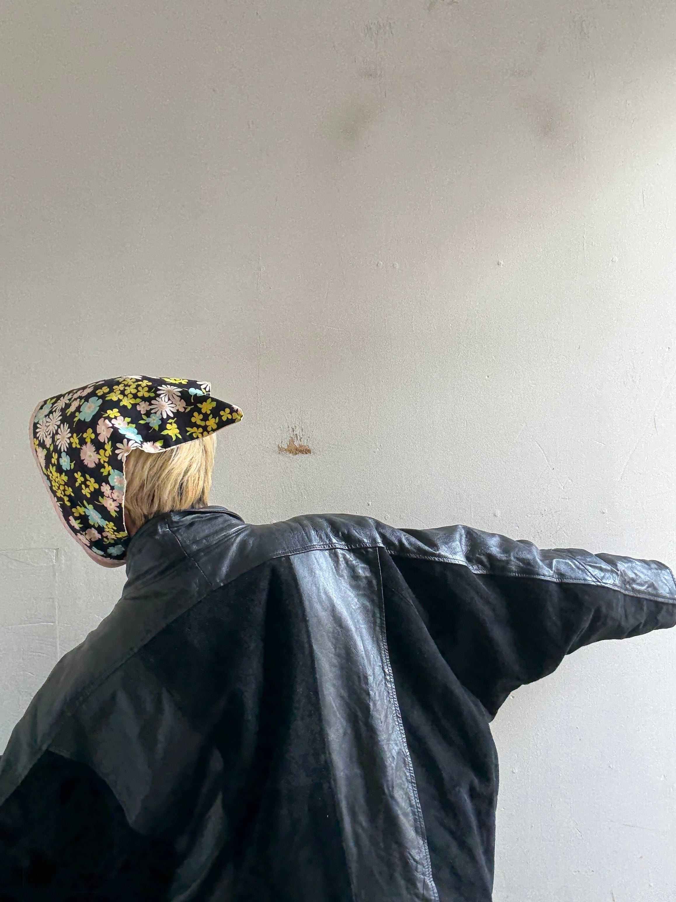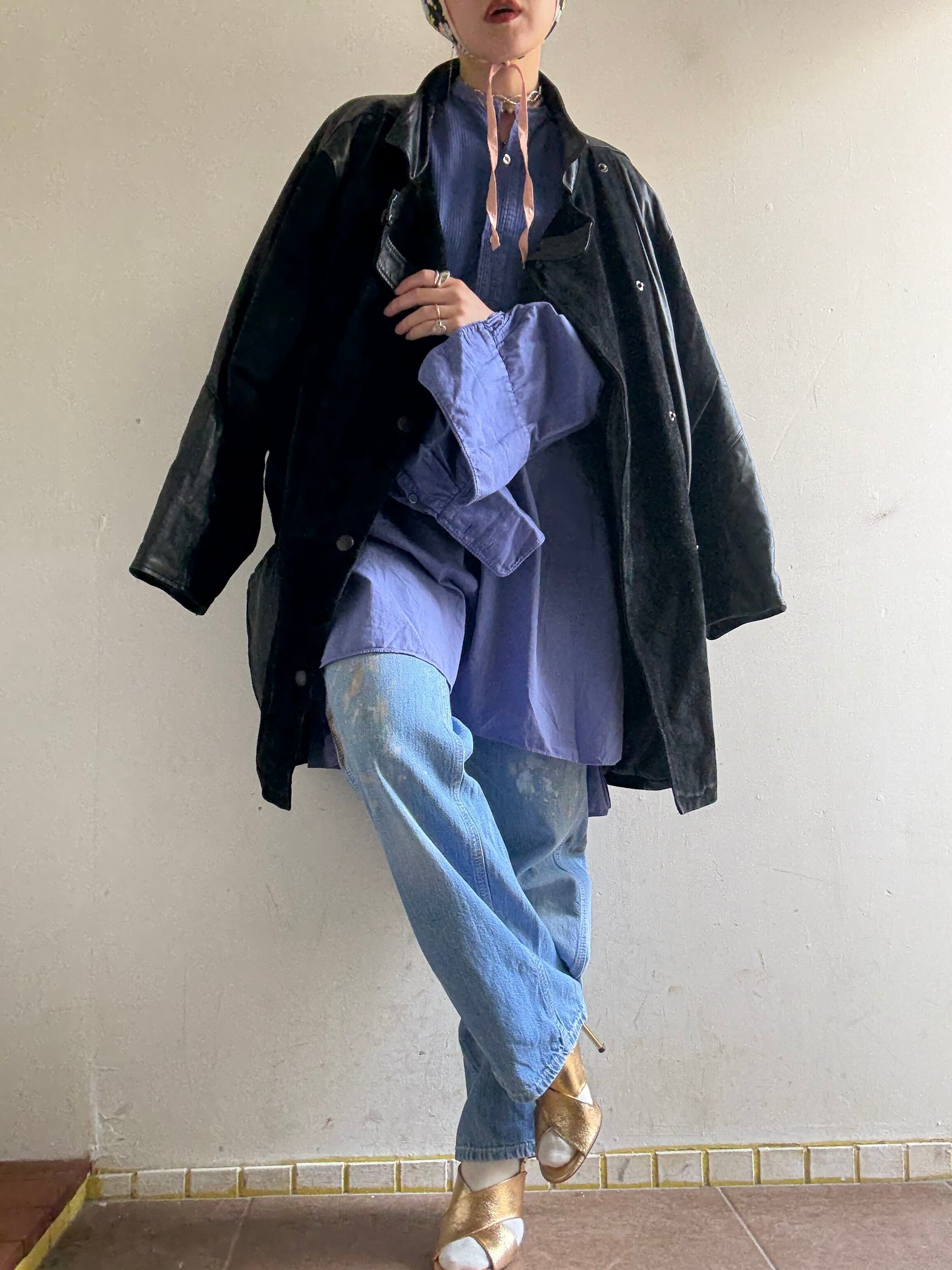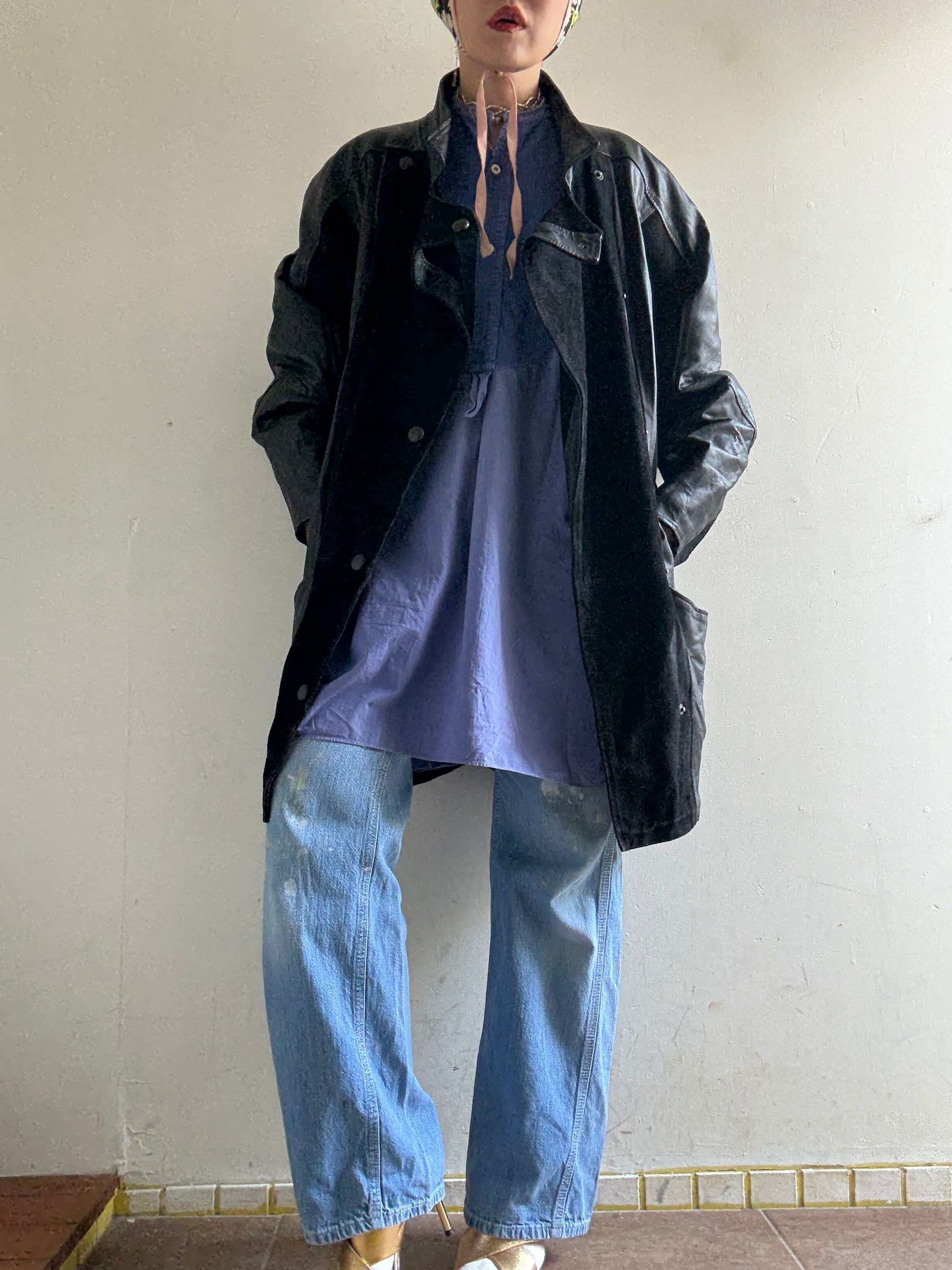 1980s Vintage Double Buttons Leather/Nubuck Patchwork Coat